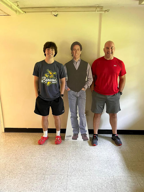 This is me with my dad, standing next to a Jerry Seinfeld cutout in my room.